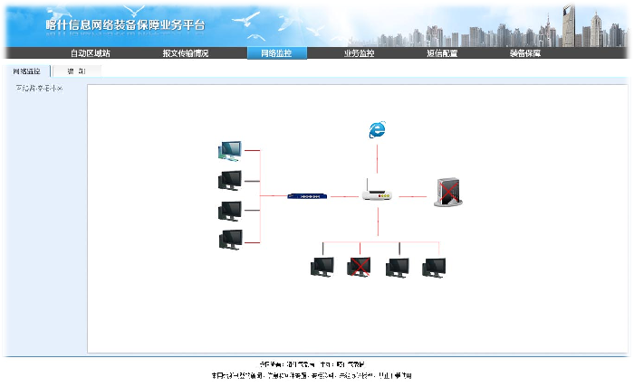 新疆喀什信息网络装备保障业务平台由信息采集监控系统、网络监控平台和装备保障平台三个系统组成。其中,信息采集监控为C/S系统,监控的主要内容是:各类数据资料的传输情况、数据异常情况、网络运行情况、服务器设备运行情况,最终将监控到的信息分类入库,为网络监控平台提供数据来源。网络监控平台为BS系统,用于对自动站、区域站数据、报文资料数据、雷达数据的传输情况和资料异常情况,网络运行状况、服务器设备状况进行实时展示。为不同身份的用户分配相应的权限。设备保障平台为BS系统,提供了国家级台站、区域自动站、计算机等设备的信息管理功能,设备维护情况的查询和管理,设备库存信息的管理,人工影响天气的作业编辑查询等功能。为不同身份的用户分配相应的权限。